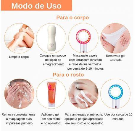 O uso do Massageador Ultrassônico com junto com cosméticos pode refinar ainda mais o tratamento e também as atividades das células da pele, a expansão efetiva dos poros na superfície, ajuda o aparelho a levar mais profundamente a reação do produto.